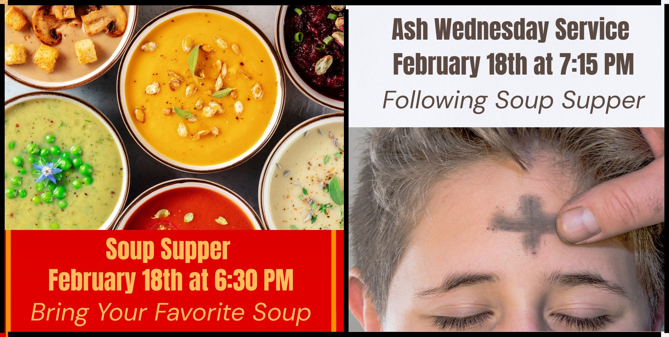 This year, Ash Wednesday and the start of Lent fall on February 18th. Bring your favorite soup to share. The church will supply the cornbread, crackers and drinks. There will be no charge this month. Please let us know if you plan to attend by February 12th. The service will take place in the Sanctuary, following our soup supper.